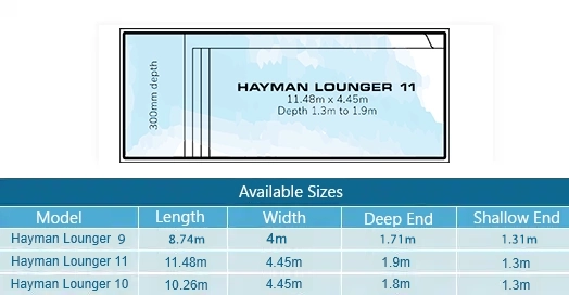 Hayman Lounger 11.48 x 4.45 Available Sizes Model Length Width Deep End Shallow End Hayman Lounger 9 8.74m 4m 1.71m 1.31m Hayman Lounger 10 10.26m 4.45m 1.8m 1.3m Hayman Lounger 11 11.48m 4.45m 1.9m 1.3m